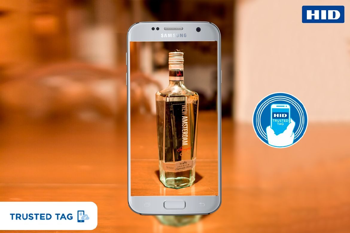 Uma etiqueta NFC segura da HID está incrustrada na etiqueta de cada garrafa de licor, que está vinculada ao serviço de autenticação em nuvem da HID. Ao tocar a garrafa com um telefone iPhone ou Android, o cliente ativa um canal de comunicação seguro que autentica a procedência do seu produto prémium, até o número real da garrafa.