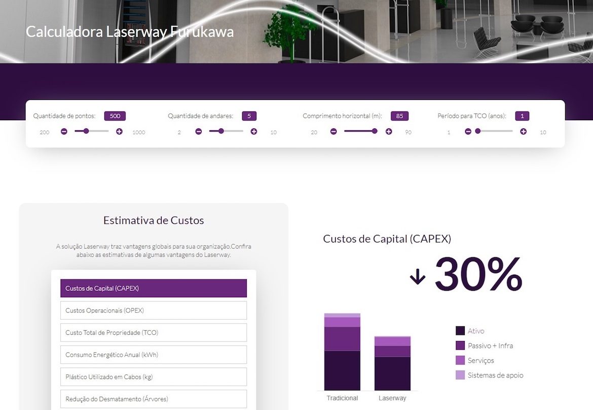 Para obter esses gráficos, a empresa deve inserir na calculadora alguns parâmetros do seu projeto de rede: quantidade de pontos, número de andares, comprimento horizontal e período (anos) para alcançar o Custo Total de Propriedade (TCO). A partir desses dados, a ferramenta fornece estimativas (com base em valores comuns de projetos genéricos) comparando os custos de investimento (CAPEX), custos operacionais (OPEX), TCO, consumo energético anual (kWh), espaço ocupado, plástico utilizado em cabos e até a redução do desmatamento (árvores) da solução Laserway e de uma rede tradicional.