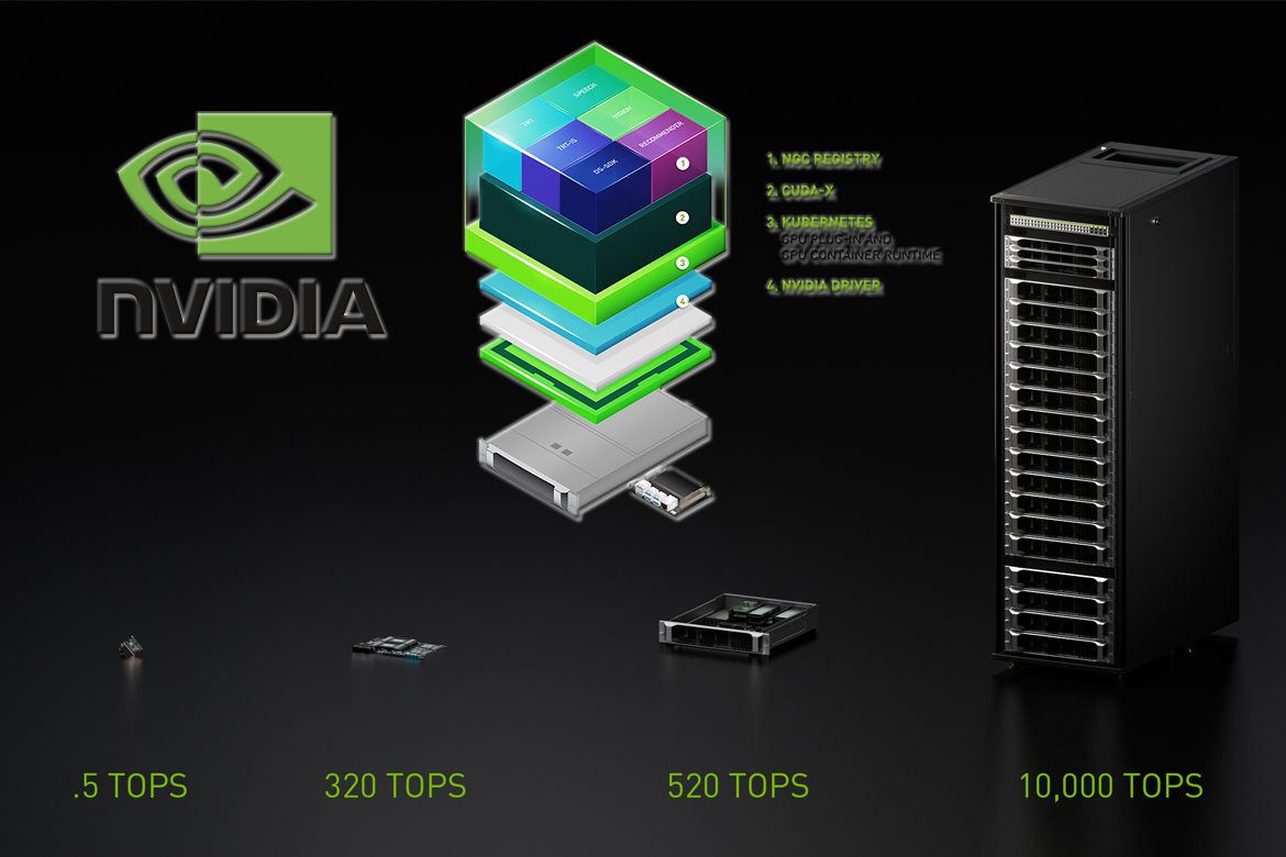 A EGX começa com a minúscula NVIDIA Jetson Nano, que em poucos watts pode oferecer meio trilhão de operações por segundo (TOPS) de processamento para tarefas como reconhecimento de imagem. Além disso, abrange todo o caminho até um rack completo de servidores NVIDIA T4, oferecendo mais de 10.000 TOPS para reconhecimento em tempo real de fala e de outras tarefas de IA.